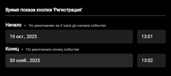 Время показа кнопки "Регистрация" - временной отрезок в котором посетители могут зарегистрироваться на событие