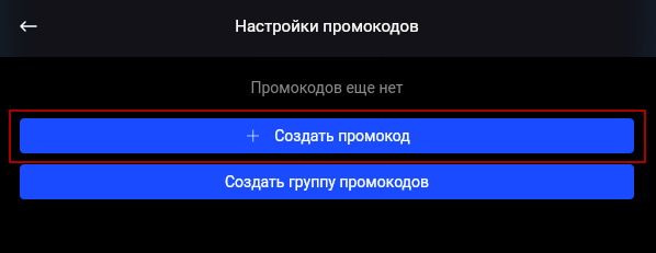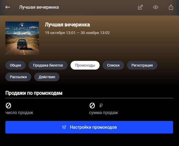 Организатору доступен гибкий функционал работы с промокодами. Создание и редактирование промокода достуно по нажатию кнопки "Настройки промокодов"