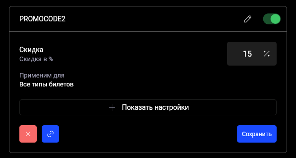 После сохранения промокода доступно сохранение уникальной ссылки, включающей в себя данный промокод. При переходе по ссылке промокод будет автоматически применен к установленным для него и доступным для покупки типам билетов.