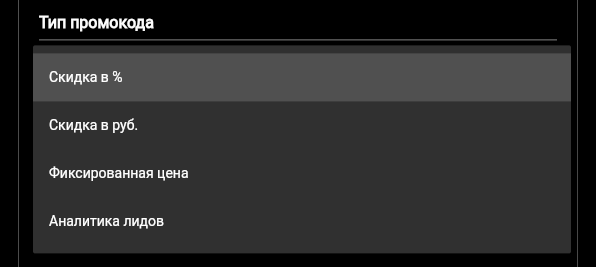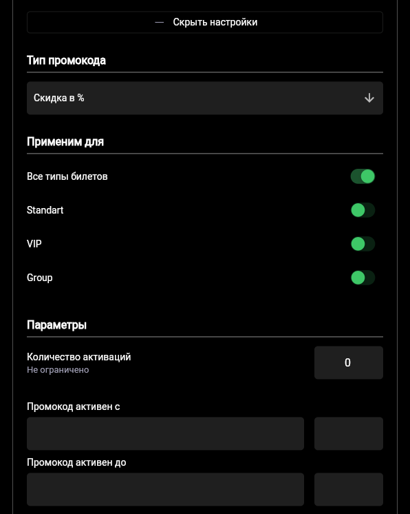 В случае выбора конкретных типов билетов для применения промокода, при добавлении новых типов билетов действие данного промокода распространяться не будет. При необходимости потребуется дополнительное включение новых типов билетов к данному промокоду.
