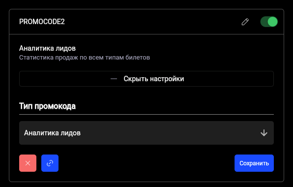 Тип промокода "Аналитика лидов" не предоставляет никаких скидок и используется только для анализа трафикаНазадГруппа промокодовДалееСтатистика промокодовРаздел FLAT.PROMO
