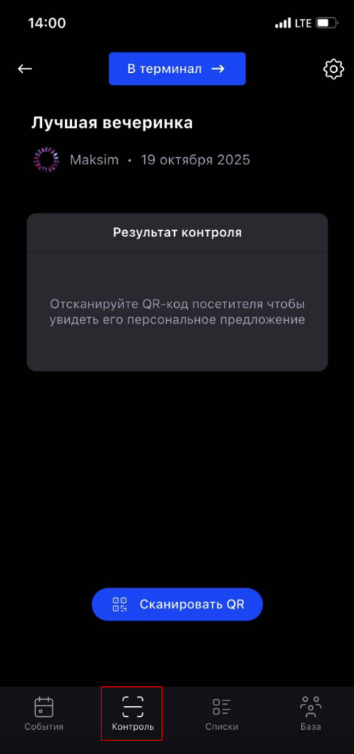 После назначения контролера в его мобильном приложении FlatPromo в разделе "Контроль" откроется функционал сканирования QR-кодов и, при наличии оплаты на входе, режим Терминала.