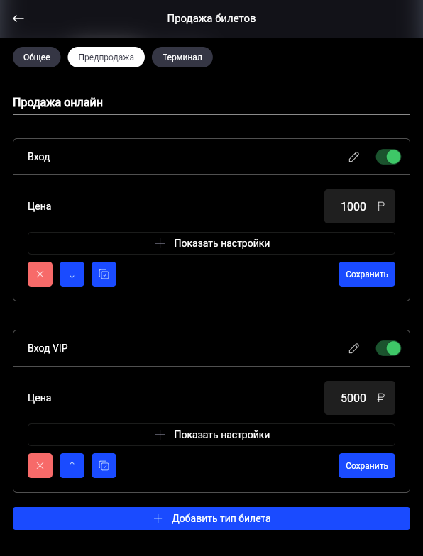 Создание и/или редактирование типов билетов доступно по нажатию на кнопку "Настройки продажи"