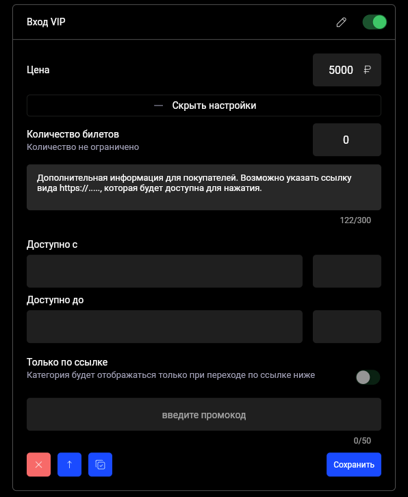 отображение типа билета только по секретной ссылке для ограниченного круга покупателей