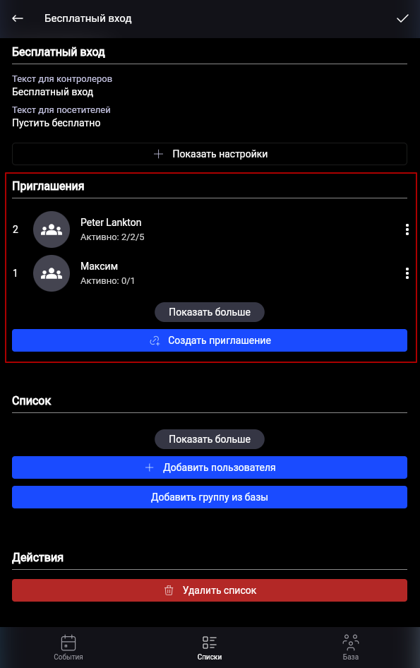 В открывшемся окне в блоке "Приглашения" отображаются все отправленные QR-коды.
