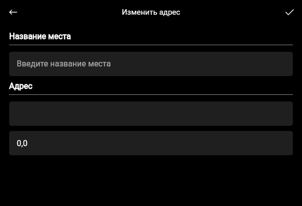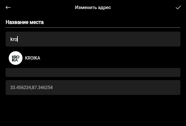 При начале ввода названия места система предложит выбрать из существующих аккаунтов мест. Достаточно выбрать этот аккаунт и адрес с координатами заполнятся автоматически