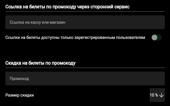 В случае реализации билетов на событие через сторонних билетных операторов возможно указать ссылку на страницу продажи билетов и промокод для пользователей сервиса FlatAudio