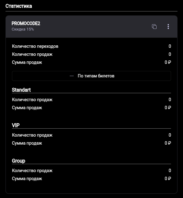 При необходимости доступна развернутая статистика использования промокода по каждому типу билетов в отдельности