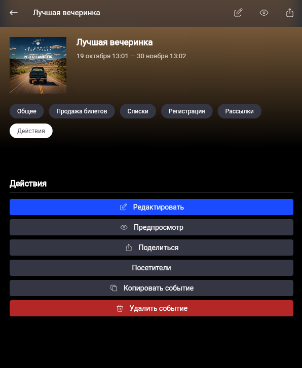 Удаление событияУдалить событие возможно до его публикацииОтмена событияПосле публикации в действиях доступна кнопка ОтменитьНазадПубликация и видимость на карте приложения FlatAudioРаздел FLAT.PROMO